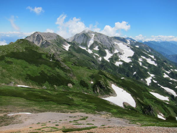 日は時々陰るようになったものの、喉の渇きは相変わらず。残り2本のビールは小屋で飲むつもりにしていたが、ガマンできずに清水岳でプシュ!一番美味しいと思う時に飲むビールが一番美味しいです!喉は乾くがおなかは減らない。結局、行動中に食ったのは白馬岳での冷やしうどんのみ。