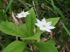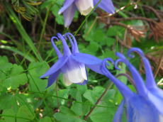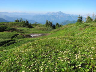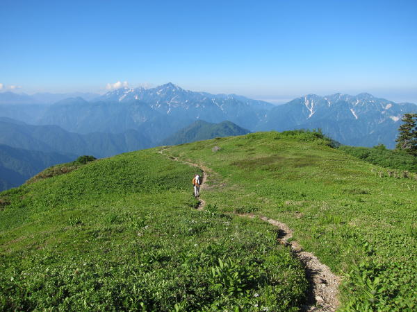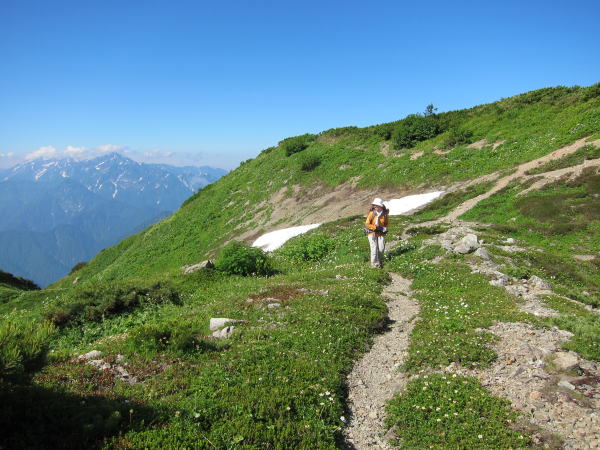 朝イチからダラダラと横歩きが続くが、朝イチなのであまり苦じゃない。樹林帯なので涼しくてありがたいくらい。樹林帯が広葉樹の灌木に変わると、朝日を浴びて暑くなる。振り返ると立山・剣が・・・。きのうは雲で見えなかっただけに、うれしい景色だ。小1時間ほど歩いてやっとお花畑。