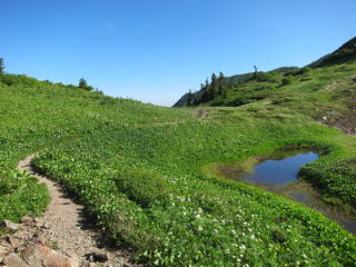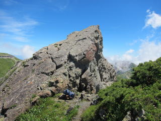 さあ、ボチボチと避難小屋に向かいますか。ここから先は明日ゆっくり歩くことになるだろうから、観光はほどほどにして足を早く進めることにする。しかし、祖母谷方面から登ってくる人が結構いる。5組は見た。この時間にここを歩いているってことは、昨日は不帰岳の避難小屋にとまったってこと?今日は土曜日だから今日も一杯になる?2人の方が早く着いてそうな気もするけど、一応マジメに歩いて早く着くようにしよう。今さらだけど・・・。