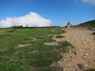 旭岳を出る頃から清水尾根には雲がかかるようになる。お天道様も真面目に歩けと言っているんでしょう。しかし、真面目に歩くと清水岳までの長いこと長いこと。ただ、時々曇りになるので暑さは和らいだ。今日は珍しく短パン。ふくらはぎがボチボチ焼けてきたようだ。清水尾根は通る人が少なく、手入れもあまりされていない。ところどころにハイマツや笹が覆いかぶさっている。短パンだと不快なので清水岳で休憩した時に長ズボンに履き替えるとしよう。