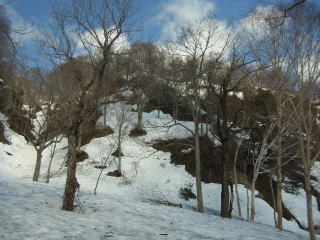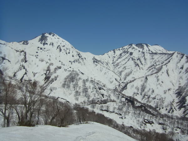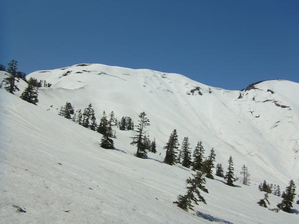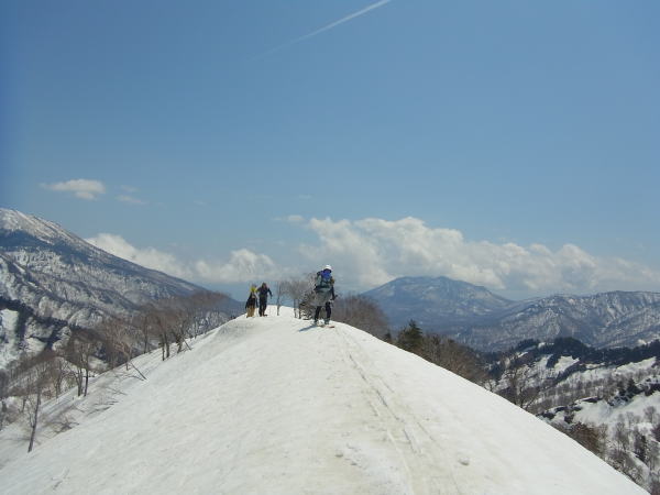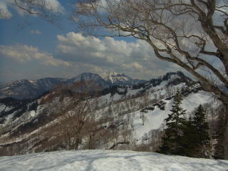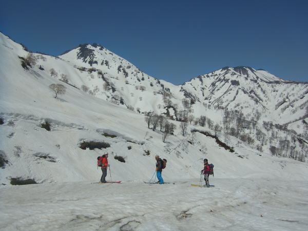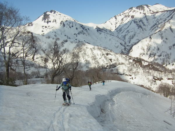 板を背負ったまま滝沢出合まで歩き、そのまま尾根に取り付く。3パーティー入り乱れながらだが、尾根に取り付いたのはボクが最初。雪を蹴り込みステップを作りながらブナの台地を目指す。この尾根雪が少なそうに見えたけど、夏道を歩いたのはわずかで済んだ。登り着いたところが1400mのブナの台地。なかなか感じの良いところでした。