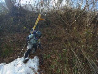 まずは林道に雪が付いててひと安心。しばらくで一ヶ所切れたものの、切れたのはこれっきりで杉野沢橋へ。ホントに晴れるのかなあ・・・と思っていたが、徐々に空が明るくなってきた。橋を渡って真川右岸を遡ると、尾根の張り出しで行き詰まる。川沿いには夏道のロープが垂れていたけど、板を背負ってのスキーブーツでは困難。雪の斜面を登り小さく巻く。降り口に雪が付いてなくて、ちょっと悪かったのでロープを垂らして通過。他のパーティーは大きく高巻いていた。大きく高巻くと疲れそうだけど、危険は少なそうだ。きっと大きく高巻くのが規定?のルートなんでしょうね。