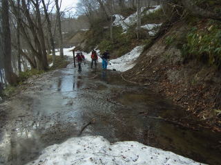 1701mからは登ってきた沢を滑ります。ハーフパイプ状で楽しく滑ることができました。ブナの台地を末端まで進んだところで、ツボ足モードに変身。真川までツボ足で下ります。高巻きのところはロープを残置しているので、それほど手間をかけずに通過。杉野沢橋でシール着けて、緩い登りベースの林道をトボトボと1時間かけて駐車地まで戻りました。途中で雨がパラパラと降ってきましたが、本降りになることはなく、助かりました。
