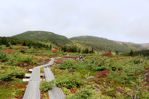 いよいよ紅葉シーズンの始まりです。10月1週目は金曜日を休んで3連休にして東北紅葉シリーズ。週間予報ははじめ頃は割といい感じだったのに、変な台風が2つできてから微妙な雰囲気。スカッとは晴れそうもないけど、中止にするほど悪くもなさそうな…。ホント微妙。ダメ元で行く距離ではないですが、ダメ元で行ってみることに。 前夜発の嫌いな我が家は朝3時出発で東北へと向かいます。9時に福島あたりだろうから吾妻山あたりが妥当な線か。楽して浄土平まで車で上がり、東吾妻山と一切経山に登り、鎌沼と五色沼を散策することに。紅葉のほどはどんなもんだか知らないけど、一度は歩いておきたかった場所でした。五色沼の紅葉はキレイっぽいというウワサ。