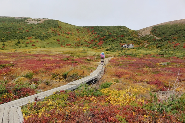 分岐を一切経山方面に進むとすぐに酸ガ平小屋。小さいけどキレイな小屋で、公衆便所も併設です。ま、ここに泊まる人は少ないでしょう。避難小屋ってとこか。浅い沢形を登っていきます。この付近なかなかの紅葉でした。振り返ると草紅葉の酸ヶ平が広がっています。しばらく平坦なところを歩いていたので、この登りたいした登りじゃないのに疲れました。