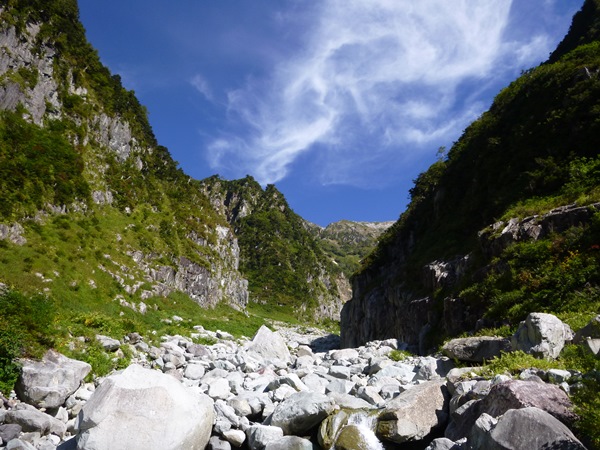 ようやく穴毛谷下部の箱状も半分を過ぎたあたりで、左からほぼ1:1で四ノ沢が出合います。水量的にはほぼ二俣ですね。ドン付きの奥壁は笠ヶ岳本体になるのかな。ここらへんもスケールの大きな景色。もし沢の中で泊まるとすれば、この四ノ沢出合が最適かな。でも、歩きはじめてまだ3時間。ちょっと早いかな。でも、遅くに出てここで泊まっても、翌日笠ヶ岳くらいまでは余裕で届くでしょう。これもありかも。