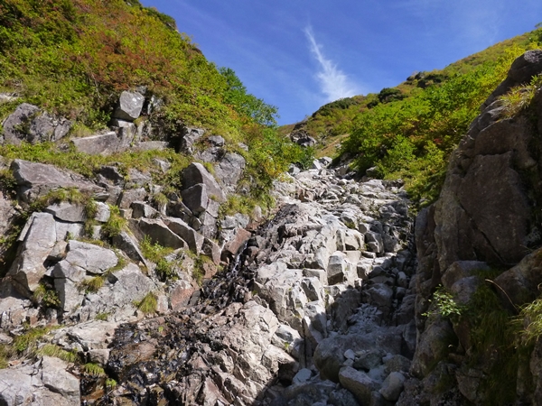 降り着いた沢がこれまたいいとこで、階段状の滝が天国へと続いているかのよう。しばらく小滝が連続するのですが、このあたりが今回の中で一番景色良くて楽しいところだったような。何度も書くけど、紺碧の青空に白くて明るい岩と紅葉始まった中に濃い緑が映えてます。山は天気が一番です。これが日が差さなかったとしたら、別に何も感じなかったかもしれません。