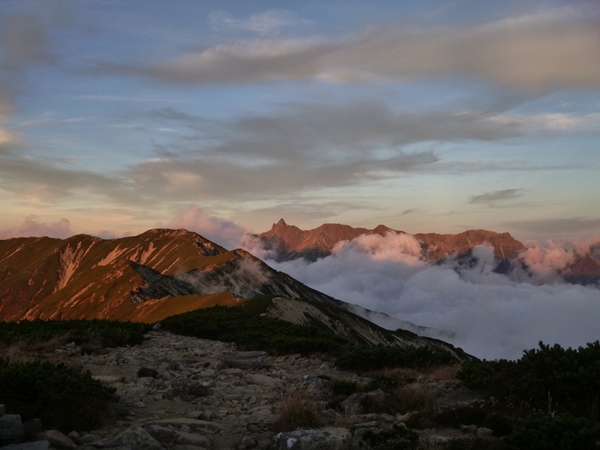 下界もだいぶ寒くなって、もうビールって感じじゃないのかと思っていましたが、今日はとても喉が渇きました。一応350mlのビール2本持ってきてたけど、それでは足りずに小屋で調達。音なし目の宴会。Aチン持参のアスパラの生ハム巻きが美味しかった。あとは定番のウインナーとスルメ。すっかり雲に覆われていたけど、日が沈む頃には雲がとれ始めてきて、立山までクッキリと見えるようになってきました良い日没でした。 ◆9月29日(日) 笠ヶ岳⇒クリヤ谷⇒中尾温泉口 晴れ夕方日が沈んだら寒かったけど、朝起きたら暖かかったなあ。夜明けが遅くなってきて、起きるのも遅くなってきました。おかげで、よ〜く寝ることができました。5時過ぎに起きてもまだ暗い。朝日が出る前から槍・穂高のシルエットがキレイでした。今日も快晴だ!朝飯の雑炊を食って出発です。
