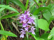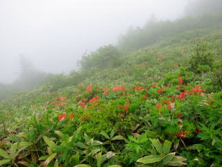 湯ノ丸山とのコルで稜線の道と合流します。ここからは灌木が生える程度の草原状変わります。レンゲツツジが点々と咲いてます。花もチラホラ咲いています。○○チドリがやたら多かったような…。登山道は南を大回りするように烏帽子岳へと向かいます。ガスで視界がないので方向感覚が狂ってしまいました。稜線に出てからも花は多かったです。