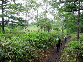 今日は真夏の暑さになるとの予報だったので、登山口が高いところを選びました。地蔵峠は風もあって寒いくらい。暑さは心配ご無用でした。まずは湯ノ丸山を南に巻く道から烏帽子岳を目指すことに。少し歩くとキャンプ場。ここらはカラマツ林でしたが、湯ノ丸山を巻くあたりから明るい(といってもガスで暗い)広葉樹の林に。晴れてりゃ良さそうだし、紅葉もよさそうな雰囲気。