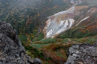 「切通し」から大地獄までは100mくらい下ります。ここまでは登ったり下ったりの連続。帰りはめんどくさそう。大地獄は鳥海山の千蛇谷に似た地形です。同じ形の火山なんでしょうね。鬼ヶ城が外輪山かな。大地獄から黒倉山の東斜面の紅葉がキレイでした。ちょうどこのあたりで日が差してくれてラッキーでした。