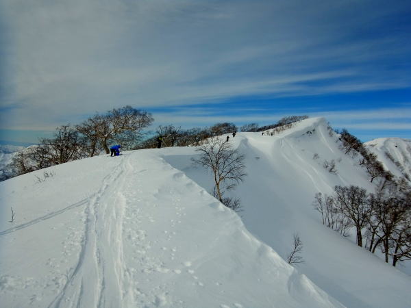 きのう、おとといと関山では記録的な大雪でしたが、妙高山の裏側にあたる三田原山あたりはそれほどでもなさそう。多少のブッシュや地形が露出しているところがあったけど、この時期にこの量があれば御の字でしょう。登るのも滑るのもとくに支障はナシ。天気は予報通りの快晴。どちらかというと南の方が悪く、薄雲が出ていて水墨画のような雰囲気になっていましたね。