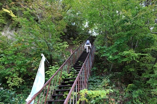 小豆温泉の駐車スペースには先客2台。まずはスノーシェードの上に登ります。こんなとこ歩けるのも珍しいなあ…といきなりのアトラクションを満喫。そして長い階段を登って登山道へ。要するに登山道があったところに後からスノーシェードができたってことか…?黒檜沢の右岸の段丘状を進みます。