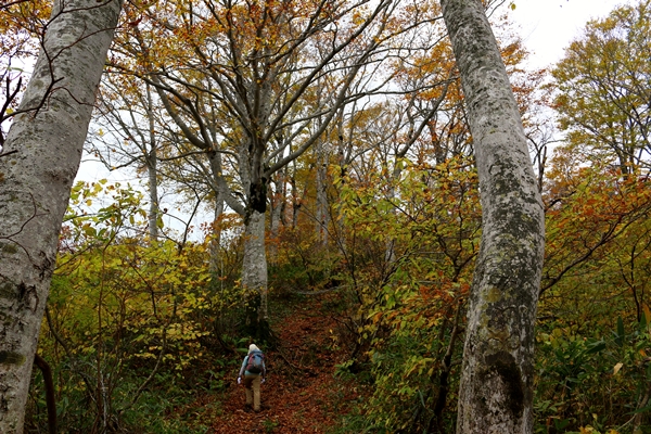 さて、下ります。笹原から灌木帯に入り、徐々にブナの丈が高くなってきました。家向山の登りに差し掛かるあたりまでのブナは素晴らしかったです。場所場所でブナ林の雰囲気が変わって飽きません。また、ブナに混じってカエデなどの赤くなる葉も多く、色とりどりといった感じで。ブナの紅葉を見るのなら、三岩岳よりも断然窓明山ですね。