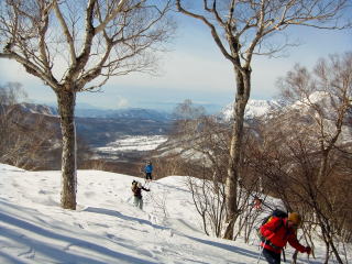 外輪山の西の末端である1893mの東のコルに登り上げました。ここからカルデラに向けて下ります。標高差は100mないし、南側が疎林なのに対して北側は細い木の密林。どうせ滑りは楽しめないので、手間を省くためにもシールのまま下ります。雪が重くて滑っていかないなあ〜。わずかな時間だったのに、太ももがパンパンになってしまいました。