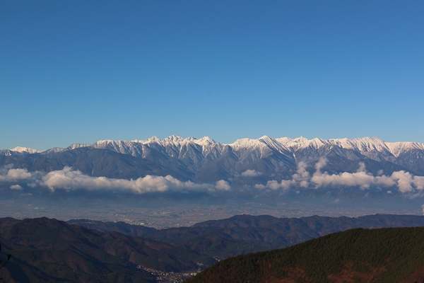 その北アルプスですが、しっかり降った直後だけあって真っ白けっけです。安曇野や松本平から見上げるのと違って、やや距離を置いて高い目線から見るので、白さが際立っています。天気が良くて空気が澄んでいるので尚のことです。ここからは主に常念山脈から南と槍・穂高、そして乗鞍岳が見えていました。