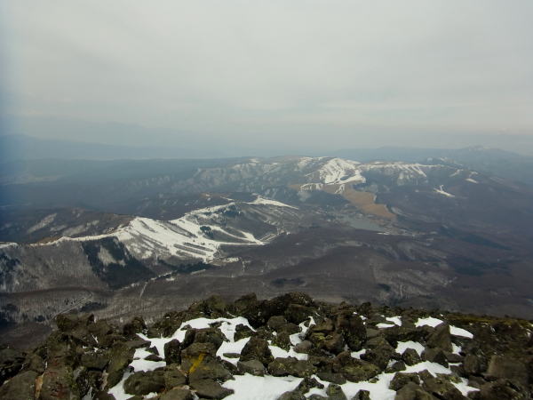 山頂は強風ではないけど、多少の風あり。展望もパッとしないので長居は無用。でも、久しぶりなので丸い山頂を一回りしておきます。見えるべき山は一応見えてはいるんですけどね〜。登山口の車の数のわりに、山頂にいる人は少ないなあ・・・。結構すれ違ったり抜いたりしたから、こんなもんか・・・。