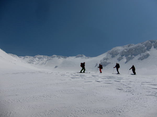 山頂を半周して新山を後にします。そして滑ります。千蛇谷は心配していた通りに小さなシュカブラがあって、板がバタバタして押さえるのが大変。太ももにきますね〜。でも、この日本離れしたロケーションの中を滑ることができて幸せです。前に千蛇谷に来た時には、もっとたくさんの人がいたような記憶があったけどなあ…。今日は少ないような気がする。こんなに良いお天気なのに。