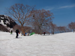 4〜5時間を見込んでいましたが、3時間でテン場です。どうもボクの頭の中は3/下から4/上の情報が詰まっているようですね〜。鳥越川が割れているところがあって、そこから水を汲めたのでガス節約です。テントを張って真昼間から宴会。時々晴れかけるものの、しっかりとは回復してきません。明日に期待!ですが、ちょっと心配だなあ…。 ◆4月29日(祝) テン場⇒鳥海山(新山)⇒テン場⇒中島台 晴れのち薄曇り朝方は冷え込むかと思っていましたが、4人入りテントということを差し引いても暖かかったなあ…。4時半起床。起きた時は鳥海山の山頂あたりに雲がかかっていました。次にテントから出た時には快晴になってました。ヨシヨシ…なんとか山頂に着くまでは晴れのままでいてくれよ〜。朝からモチ入りラーメンで満腹です。