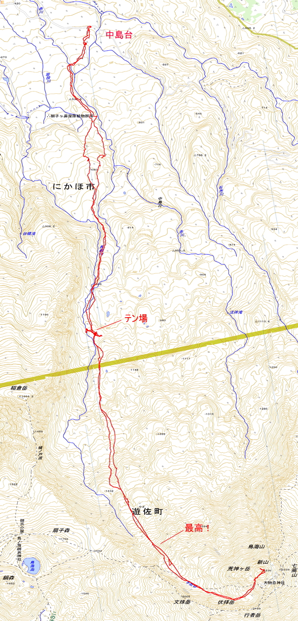 赤川と鳥越川の間が狭くなってくると、下流に向かって川が分かれる変な地形です。こんなのも「略奪点」と呼ぶのか?もともと中洲だったのが左右に分かれたんでしょうか…?この地形に興味があったので、見ることができてよかったです。なんてことはなかったですが…。「略奪点」の先で景色が広がります。樹林もなくなります。ただ、天気は回復してこない…。風が強いので、これ以上登ると辛くなるかな。徐々に斜度が増してくる標高1000m弱のところをテン場にしましょう。
