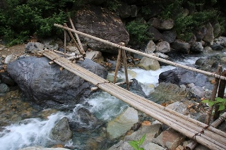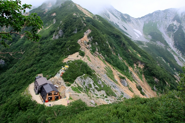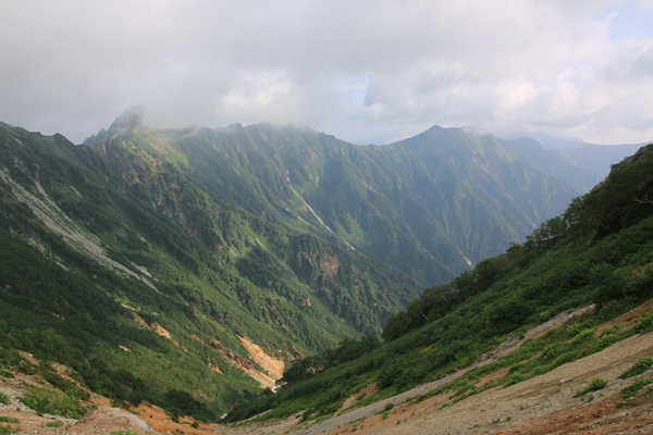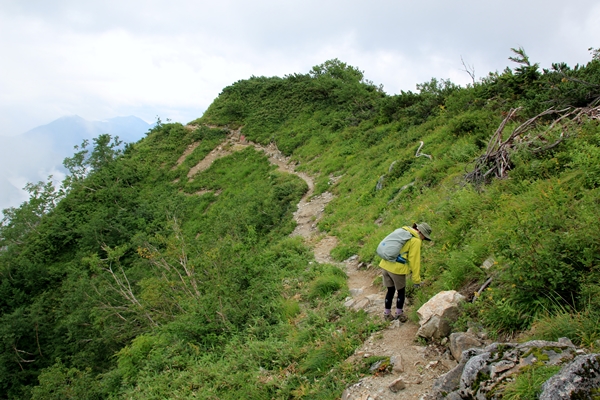 北葛乗越までの激下り。500mも下ります。南アルプス並みの数値ですね。下りが長いと脚がやられるので、抑え気味に歩きましょう。抑えるまでもなく、足元が良くないのでガンガン下れません。前半は砂利道で後半は険しくて脆い岩場の道。蓮華岳から烏帽子岳までの間は、北アルプス屈指のマイナールートです。にもかかわらず、大きな団体さん2チームいたりで意外と賑やか。