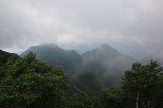 峠の反対側はどんなでしょう…?ウ〜ン、似たようなもんか…。このあと通る北葛岳と七倉岳がぼんやり見えています。直線だと近いんですけど、蓮華岳経由なので距離もアップダウンも大きいです。今日の正念場かな。立山や裏銀方面の山々は雲の向こうです。予報だと今日は昼にかけてがマシな感じ。最低このくらいで、できれば晴れてきてもらいたいところです。