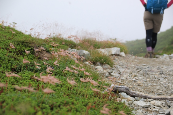 あとは七倉に向けて1400m近い下り。ダルいけど2時間少々の辛抱です。天狗の庭手前のお花畑ももう秋の気配がチラリホラリ…。展望の良い尾根歩きは少しで終わって、あとは木の根っこが張り巡る歩きにくい道。今日一番の汗をかきながらの下りでした。2時間ナンボかかりましたが、しゃべくりながら下っていたので気分的には早かったかな。扇沢に車取に行ってオシマイです。
