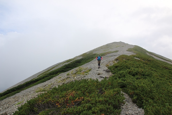 蓮華岳を下るころから霧雨が…。ガスが濃いもんで霧雨になるのかなと思っていたら、そのうち粒の雨が降ってきました。まずはカメラから避難。ザックにしまいます。少し本降りになったので、カッパの上とザックカバー装着。ヤレヤレ…この先どうなのかなあ…。蓮華岳を越えれば後戻りはできないので行くしかないです。 北葛岳の山頂は小雨。しかも強くはないけど風がある。休憩する雰囲気なし…。北葛乗越で休むつもりが、ちょうど団体さんを抜くとこだったので通過。体力的にはよかったけど、おなかが減ってきました。今日はビール2本とコンビニ冷やしうどんを用意してました。蓮華岳でビール1本飲んで、北葛岳の山頂で冷やしうどん食って、船窪小屋で2本目のビール…の予定は大狂い。