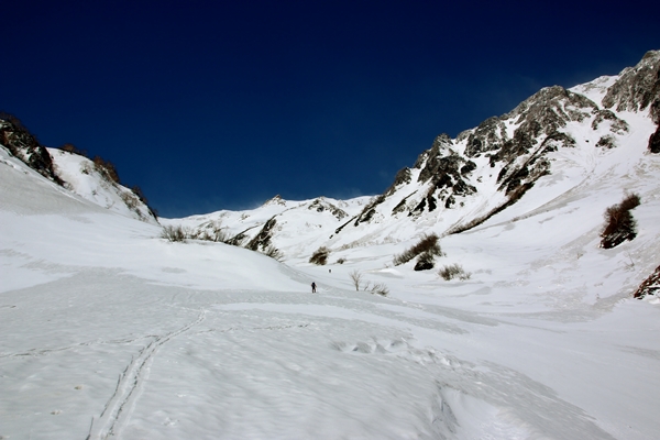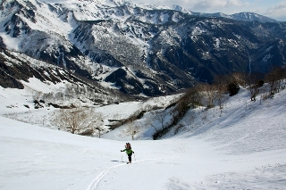 鑓温泉に向けて登ります。さっきまでの風がウソのように無風で、暑くてたまりません〜。鑓温泉までは沢が一直線に伸びていて、見えてるのになかなか近づかないというもどかしいところ。沢がくの字に曲がるところで休憩。先行の2名が見えました。あとでわかりましたが、EVA父さん御一行だったようです。新雪のおかげでずっと直登で登っていくことができました。