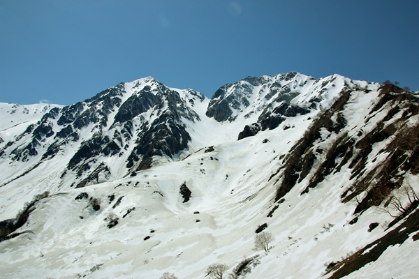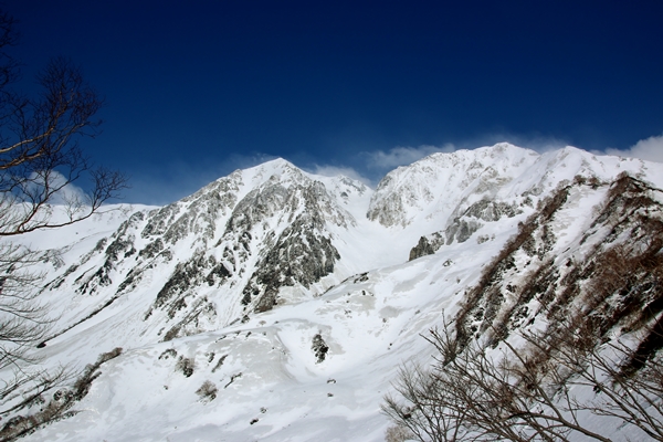 新雪は吹き溜まりで20センチくらいかなあ…忘れた。すでにギュッと詰まってて、しかもまだらに積もっているので落ちてくる気配は全くナシ。逆に緩んでからの方がドロドロと来そうです。このぶんだとお昼には白馬鑓の山頂に着けそうだ。時間的には余裕だったんですが、稜線に近付くと風が強くなってきました。