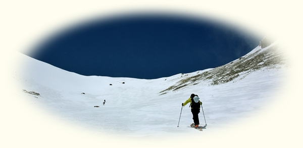 稜線に出るまでは大丈夫かなと思っていた風、すでに直下のモレーンあたりでかなりの強さ。前後左右どこから吹いてくるかわからないのが厄介です。風に対抗するにも方向が定まらないので、遊ばれているような感じでした。雪も硬くなってきたし…。askは動けなくなってるし…。まあ、戻りますか…。シールのままやや平らな部分まで戻って、そこでシールをはずして滑る準備です。