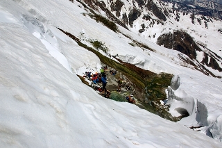 先行の2人も戻ってきたようです。上はさらにスゴイんだろうなあ〜。さっさと滑る準備して逃げるように滑り始めます。これまた雪が修行系で大変!新雪の部分は急ブレーキになるかと思いきや、あまり体験したことのない感じの悪雪で、まともにテレマークできたもんじゃありません。新雪が半融け状態で再び凍りつき、モナカに近いような感じ。でも、ちょっと違う…。くたびれました。
