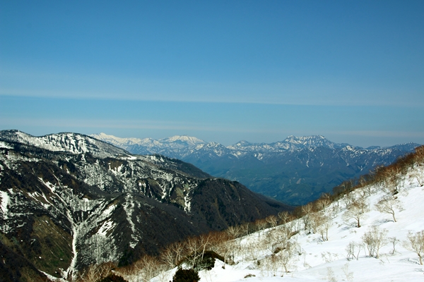 30分ほどで登り返せるんですが、ガッツリ登ってガッツリ滑った後なので、太ももにこたえます。稜線を見るとまだ雪煙が上がっていました。ま、今日はダメだったってことかな。ここからも修行を覚悟。しかししかし、わりと滑りやすい雪でした。縦溝も少なかったし。ただ、猿倉台地に入ってからも起き始めたヤブが厄介ですが、よけながら滑るのもまた楽し!往きはギリギリつながっていた林道の雪、帰りは途切れているところがありました。上はあれだけ寒かったのに、猿倉周辺はポカポカです。