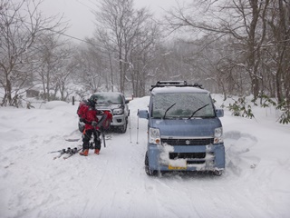 7時起床で、朝飯食って8時出発。小樽に入るあたりで黒い雲がやってきて、いきなり本降りの雪になってしまいました。さっきまでの快晴はまやかしだったのか…。銭函川沿いの車道を終点まで車で進みます。ゲートには先客2台。うち1台はN川さんの仲間の物なので、その前に駐車します。相変わらず本降りの雪。ま、これが予報通りなんですけどね…。