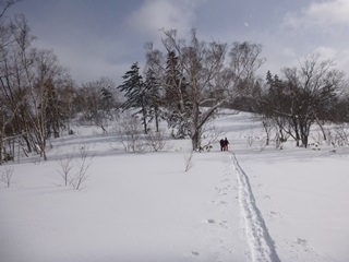 銀嶺荘からの台地に乗り上げたあたりから、雪がやんで晴れ間がのぞくように。前方に丘のような山が見えました。春香山かと思ったら隣の和宇尻山でした。銀嶺荘まで平坦なところを長く歩きます。実は今日はわけあって(忘れただけですが)地図がないのです。N川家で最後にボクが見て、ザックに置いておけば忘れることはなかったかと…。トレースとN川さんの記憶に頼っての山行です。地図なし山行訓練ということで、たまにはこんなのもいいかも。まあ、何かあったら大変ですけど。