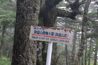 頂上まで5分のところに避難小屋。鉢盛山荘です。工事現場によくあるようなプレハブ造り。中にはプロパンガスのボンベや緊急用の水、床に敷く用の銀マットが常備。風情はないですけど避難小屋としては十分用が足ります。しっかり5分登って鉢盛山山頂。ここまでカラマツやシラビソに覆われた道で、見どころはほとんどナシ。途中に『権現の庭』がありましたが、なんか寂しい感じの湿原みたいなところ。