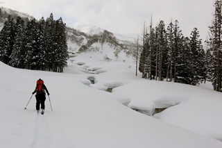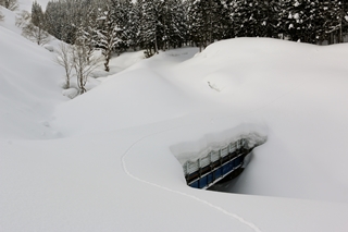 あとは自分たちが付けたトレースをボブスレー。橋を渡った先で少し登り返しがあるだけで、ほぼ滑って焼山温泉に戻ることができます。仮に登りで7時間かかったとしても、下りが1時間なので、合計8時間で行って来れるということです。7時に出れば15時に着く…と。駐車場に戻ってきて、車を運転することなく温泉に入れるってのもいいですね(日帰り入浴:500円)。安曇野から焼山温泉までは雪がなくて2時間ほど。近くはないけど遠くもない感じかな…。年に1度は必ず・・・という定番ルートには難しいですが、何年に1度かは来てみてもいいかな・・・というコースでした。