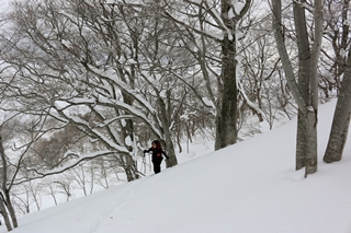 さて、滑りなんですが…。ここからの1段が急だなあ〜。パウダーだと気持ちよく滑れる斜度だけど、無木立なので気持ち悪い…。穴掘るのも面倒だし、堀ったところで確証は持てません…。こんな時は欲をかかずに、斜度を落としてより安全に…。最初は樹林の尾根を滑りますが、どうしても急斜面に入らないといけなくなります。