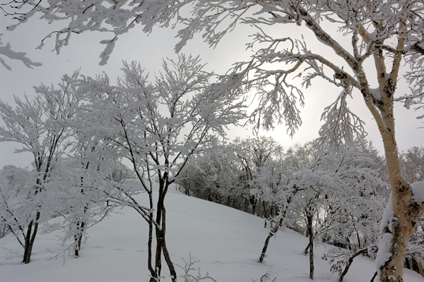 しばらくで杉の植林を抜け、広葉樹になってやっと開けます。登るにつれ、だんだんと雪が深くなっていきます。汗の量も増えてきました。4連休前半は2日とも登りはスキー場トップから西大顛だけだったんで、なんかラッセルが心地よいです!晴れててもう少し軽けりゃ言うことなしなんですが…