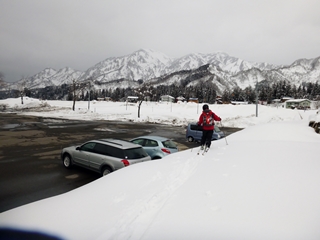 新潟県の予報は曇り。日本海に弱い気圧の谷があるそうな…。糸魚川まで降りると確かに曇り。海の方が暗い。山の方は明るくて、やや雲は多いものの今日も日本離れした景観にあり付けました。焼山温泉には先客1台。多分、新田山でしょう。焼山温泉のスキー場跡を登ります。これから目指す三角斜面がよく見えます。地図で見るより階段状だなあ〜。