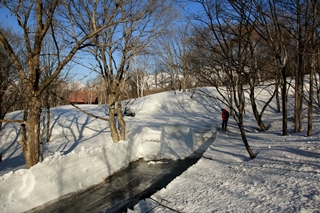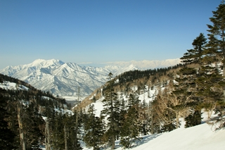 大倉山北斜面を滑ります。前回(2012年)は西側の短い方の台地を滑りました。今回は長い方の東側を滑ります。…が、やっぱり堅い。しかも雪面が平らじゃないので滑りにくいです。途中からは薄皮ながらモナカになり、ボテボテと転んでしまいます。滑ってる時に景色は最高なんですが、何しろ雪が悪いもんで景色にまで気が回りません。止まって景色堪能ですな。
