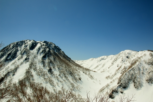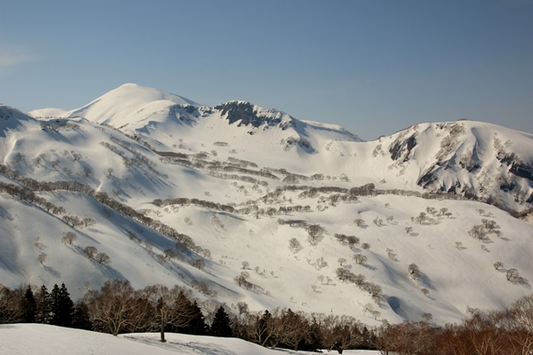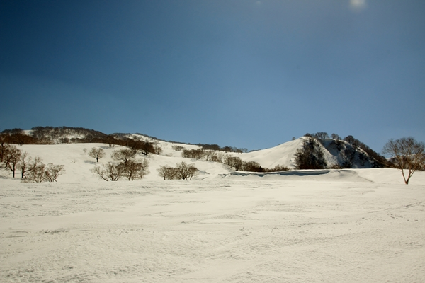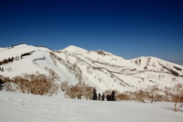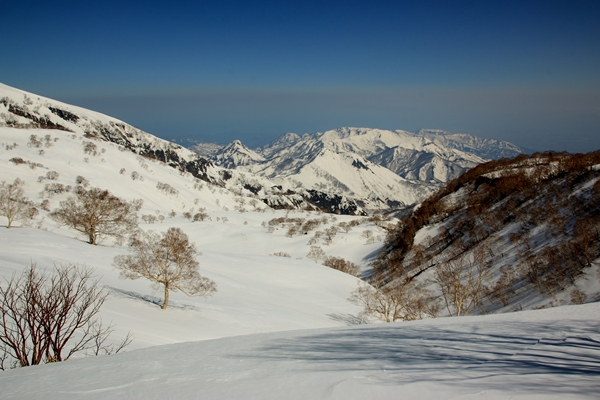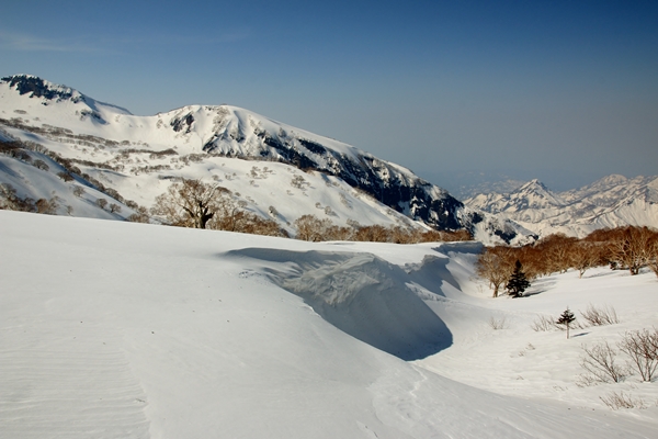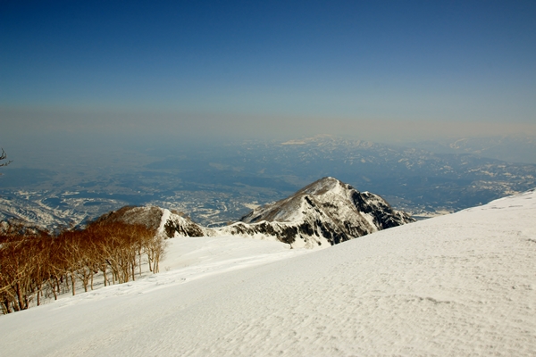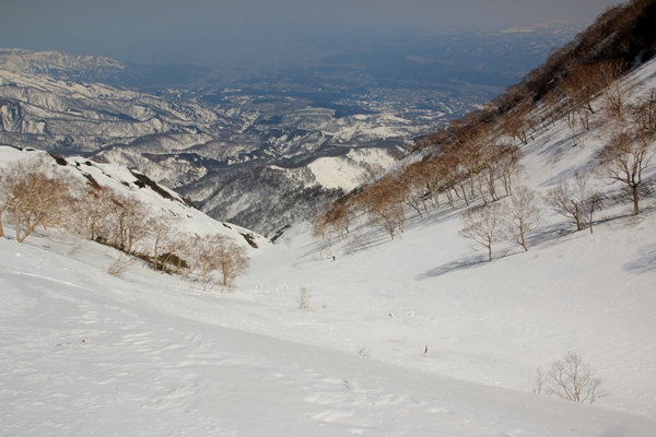 やっぱり雪は微妙でしたが、景色がスバラシ過ぎです!天然の牧場のような斜面です。標高が下がるにしたがって雪は緩み、最後の1本はなかなか快適なザラメでした。台地の末端になると火打を少し北東から見る格好になり、印象が変わります。手前にある鬼ヶ城とかが威圧的です。火打東面は上の方はマッタリ度満点ですが、その下には大滝や岩壁となり荒々しさ満点になります。そのギャップが良いのかもしれませんね〜。