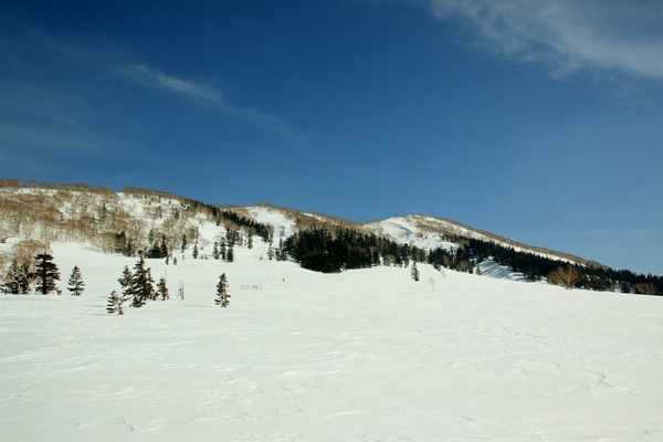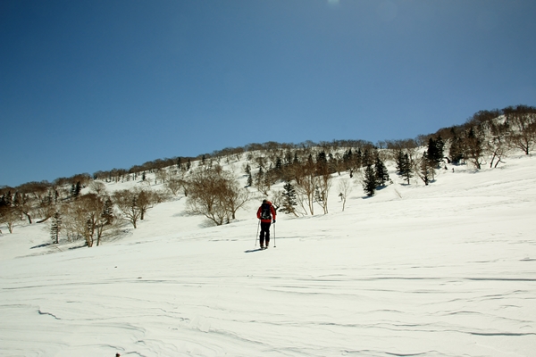 気温低くて北斜面がカチカチなのが問題。斜度があるとこはイヤだなあ…ということで、まずは大倉山に登って北斜面を滑ってみることにします。雪面が堅くてトラバース気味に登るのが厳しいです。滑るのも思いやられるなあ…。でも、景色は凄いです!火打東面のまったり度は特筆ものですね!たおやかな山容とカンバの疎林が絶妙です。