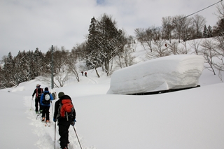 野沢温泉とかたっぷり降ってて、もちろん温井にもたっぷり降ったと思われます。そのわりにラッセルは浅く拍子抜け。風が強かったんでしょうか、雪が砕かれてしまってて詰まった雪になってます。滑るのも重いかも…。登れど登れど樹氷のブナは出てきません。樹氷の方も強風で着きが悪かったのかなあ…?