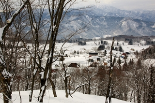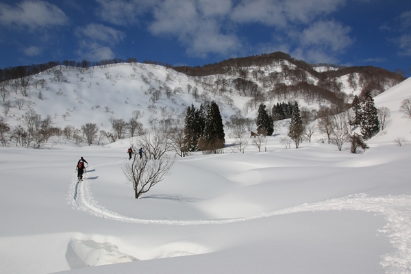 あとは温井集落に降りるのみ。日が当たって重くなって太ももパンパンになるけど、パウダー滑るのと変わらないくらい楽しいんですよね〜。こういうとこ。なんだかすっかり曇り空になってしまいました。一日中晴れてりゃ一番いいけど、曇りの時間が長かったわりに、山頂ではしっかり晴れてくれて空模様の巡りは悪くなかったような…。メンバーも新鮮でラストパウダーになる確率大の鍋倉山を楽しめました!