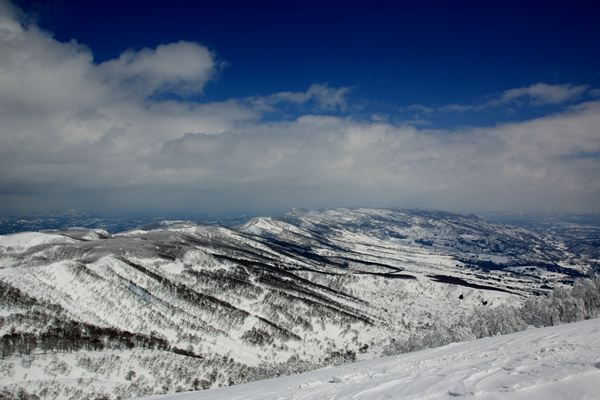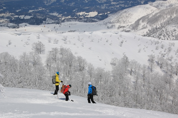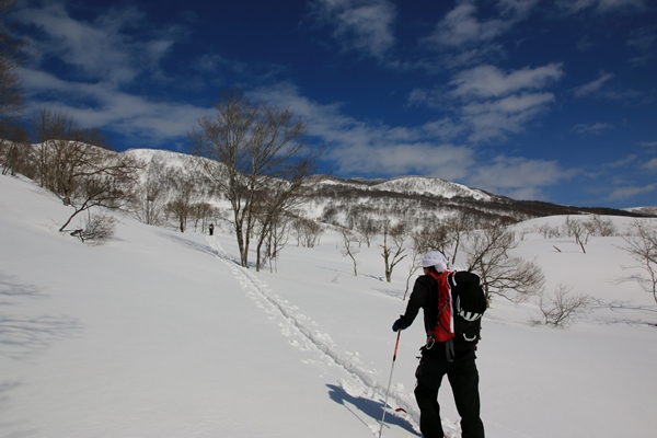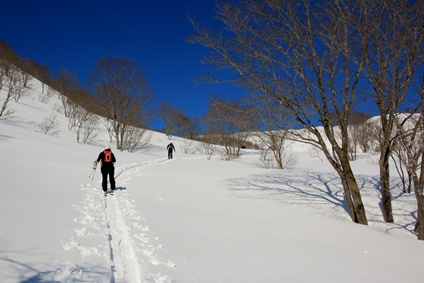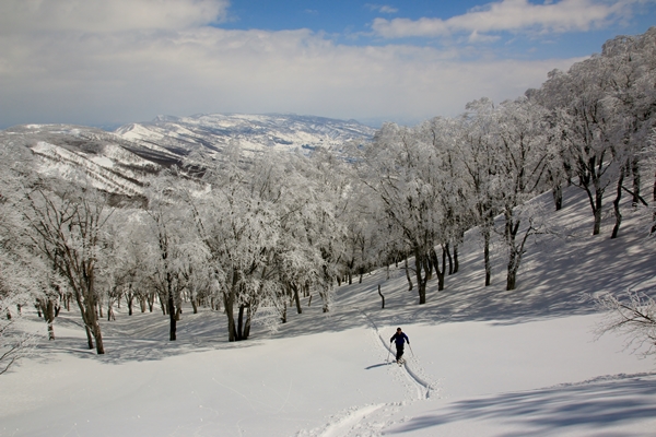さて、滑り系のロック&ブッシュだけあって、山頂の休憩はそこそこに滑降開始!山頂から直で北東面へ。山頂から見るとあまりそそらないので、これまで滑ったことはありませんでした。山頂から見えなくなったところに、楽しい斜面が隠れていました。樹間の広いブナ林と程よい斜度がしばらく続きます。雪はやや重め。重めといっても湿り気はなく、乾いてるけど詰まった雪。春分の日3連休にしては出来過ぎの雪でした。
