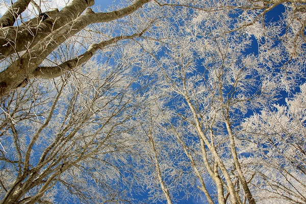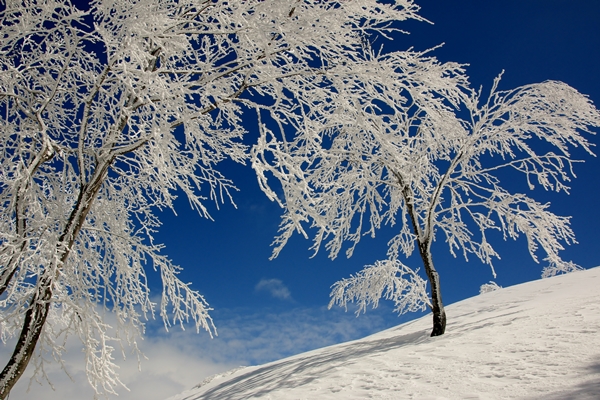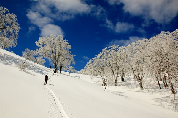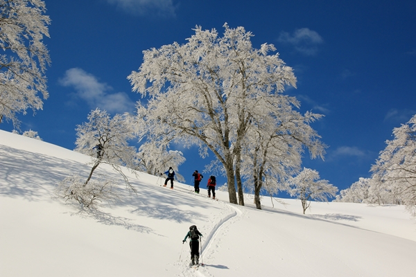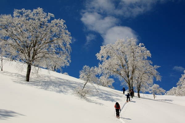 小屋から通常は尾根に取り付くところですが、番長さんの方針で裾を辿ります。降りてくるルートですかね…。こちらの方が傾斜が一定で楽に登ることができるでしょう。でも、なんか登りのルートとしては尾根の方が良いような…。ストーリーが単純になってしまう感じで…。増してや今日みたいに上のブナが樹氷になってるのがわかってる時なんて…。やっぱり樹氷のトンネルをくぐりたいところです。…と思いつつ、今日は借りてきた猫です。