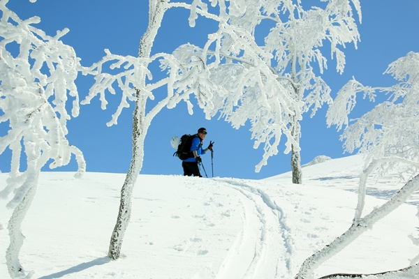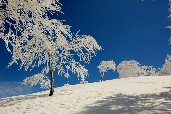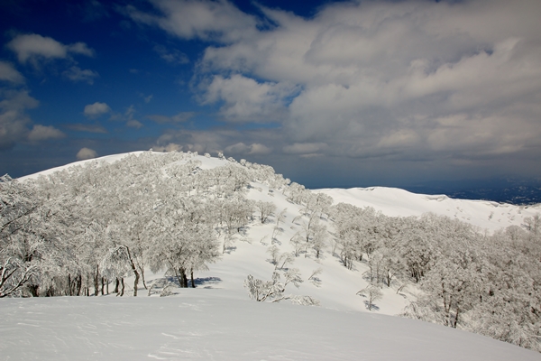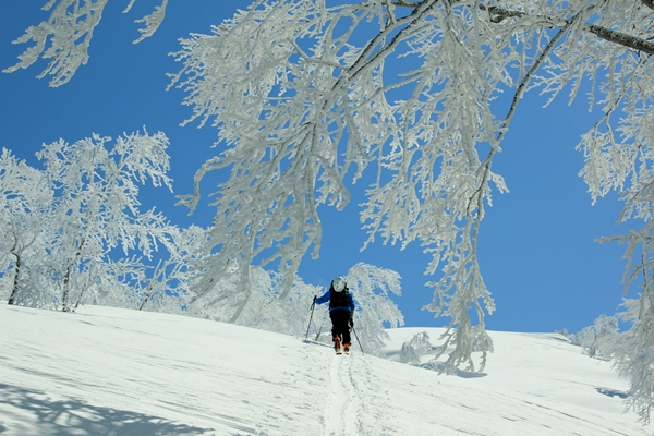 黒倉山とのコル直下から樹氷が立派になってきました。それまでは曇りベースだったのが、ここにきて青空が優勢に!願ったり叶ったりです!真っ青な空に真っ白な樹氷がステキです。途端に足が止まります。撮影撮影。数打ちゃ当たると撮りまくり。ま、もうそこが山頂なので樹氷を堪能しましょう!