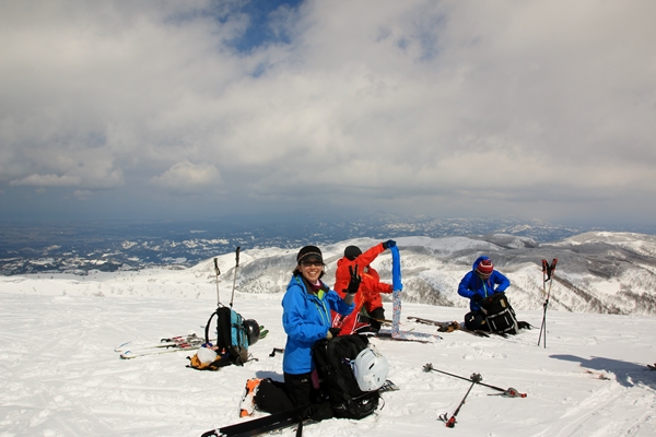 山頂到着!大賑わい!展望はまずまず。意外と雲が多いなあという印象。妙高方面は山頂あたりは雲の中だし、上越は晴れてるけど中越は未だ雪雲の下。今日は谷川方面に行かなくてよかったと思ったのでした。Yさん御一行もいらっしゃいました!記念撮影です。気温は低いんでしょうけど、無風の晴れなので快適な山頂でした。