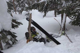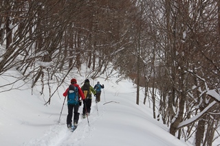 尾根が台地状になり、同時に針葉樹がブナに変わりました。今日リフトからチェックしていた台地です。ほぼ平らかと思ったけど、とりあえずスキーは滑りました。忠実に尾根…のはずが、やはり今日も途中で不動沢源頭の広い谷めがけて滑ります。一瞬で終わってしまうんですが、気持ちよく滑れました。ちょっと灌木埋まってなかったけど…。